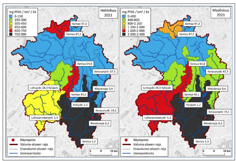 PFOS- ja PFOA -yhdisteet voivat päätyä ympäristöön niiden tuotannon tai näitä yhdisteitä sisältävien tuotteiden käytön seurauksena. Suomen ympäristökeskuksen raportissa Haitalliset aineet Suomen vesissä havaittiin vuosina 2016–2017 otetuista näytteistä Vantaanjoen PFAS-pitoisuuksien olevan selvästi muita Suomen ja Ruotsin jokia suurempia.