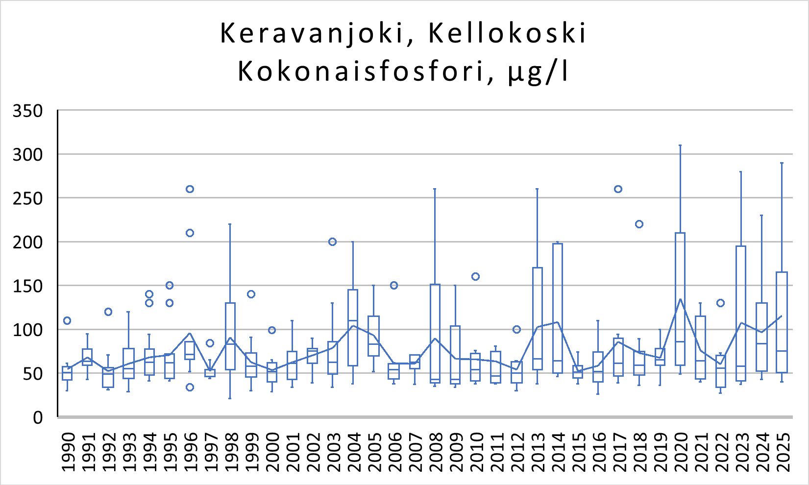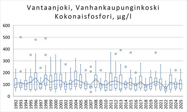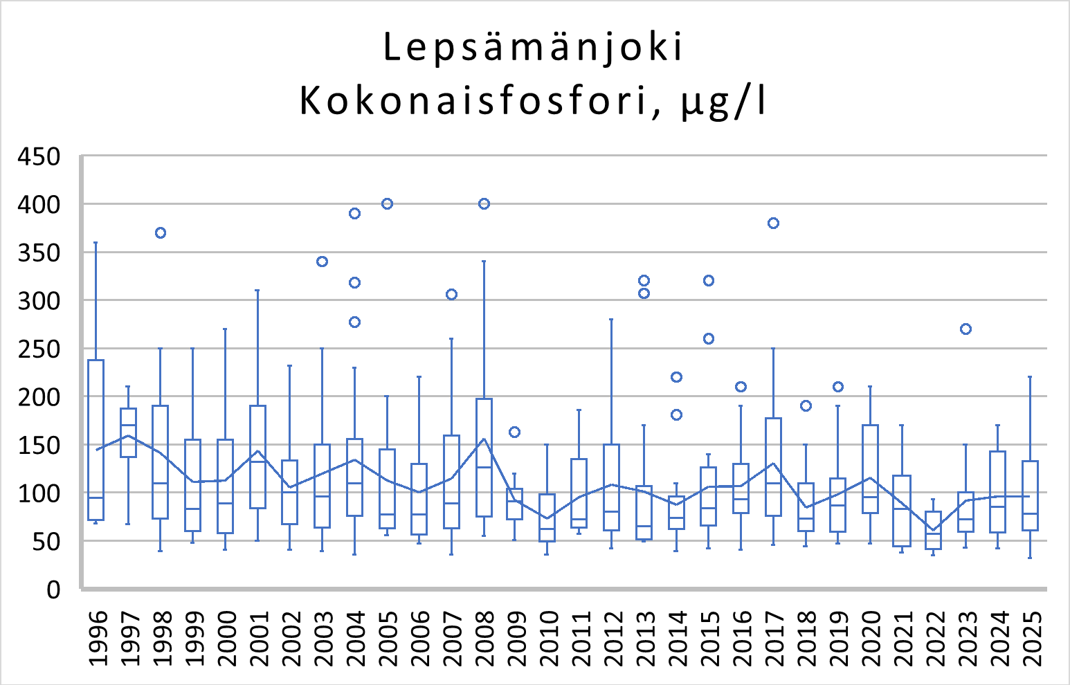 Oikealla sivupalkissa olevat kuvat kertovat viimeisten vuosikymmenten tilanteesta. Laatikko-janakaavioissa on kuvattu kokonaisfosforipitoisuuden jakaumaa vuosittain otetuissa vesinäytteissä. Kuvion laatikko sisältää puolet vuoden havainnoista ja arvojen mediaani on merkitty laatikon poikki kulkevalla viivalla. Jana ulottuu laatikon ylä- ja alapuolelle ääriarvoihin ja poikkeuksellisen arvot esitetään erillisinä pisteinä. Ne kuvaavat usein tulva-ajan korkeita pitoisuuksia. Kaavioissa jatkuva viiva kuvaa vuosikeskiarvoja.